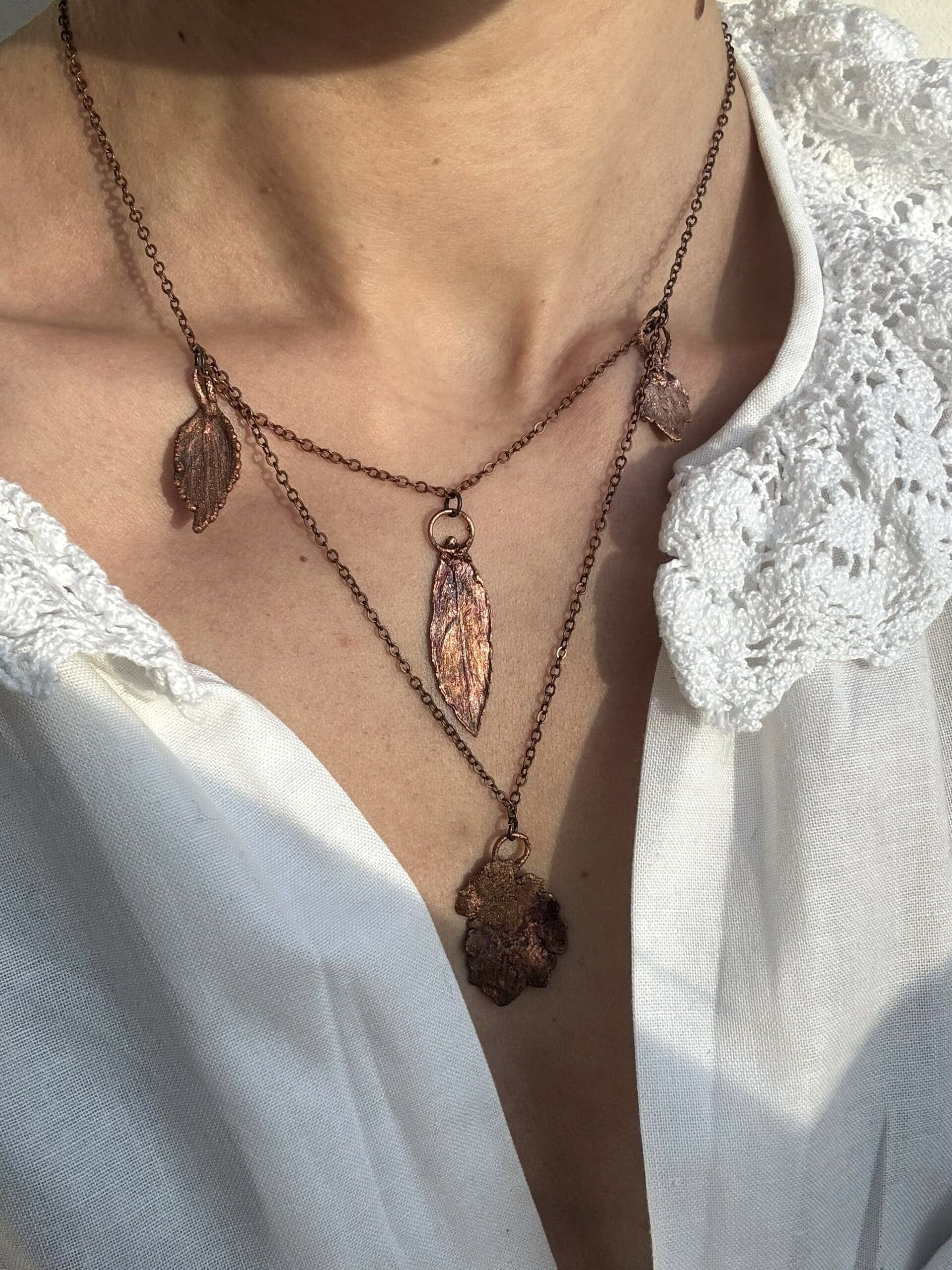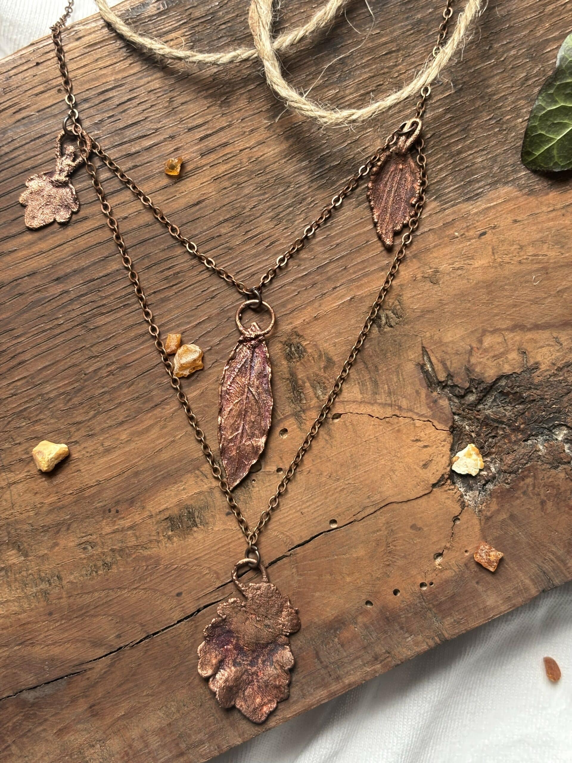 Miedziany naszyjnik z liści to autorska kompozycja stworzona z roślin znalezionych w trakcie spaceru. Wśród miedzianych zawieszek znajduje się liść pietruszki – symbolizuje oczyszczenie, ochronę, witalność oraz wiosenne odrodzenie.