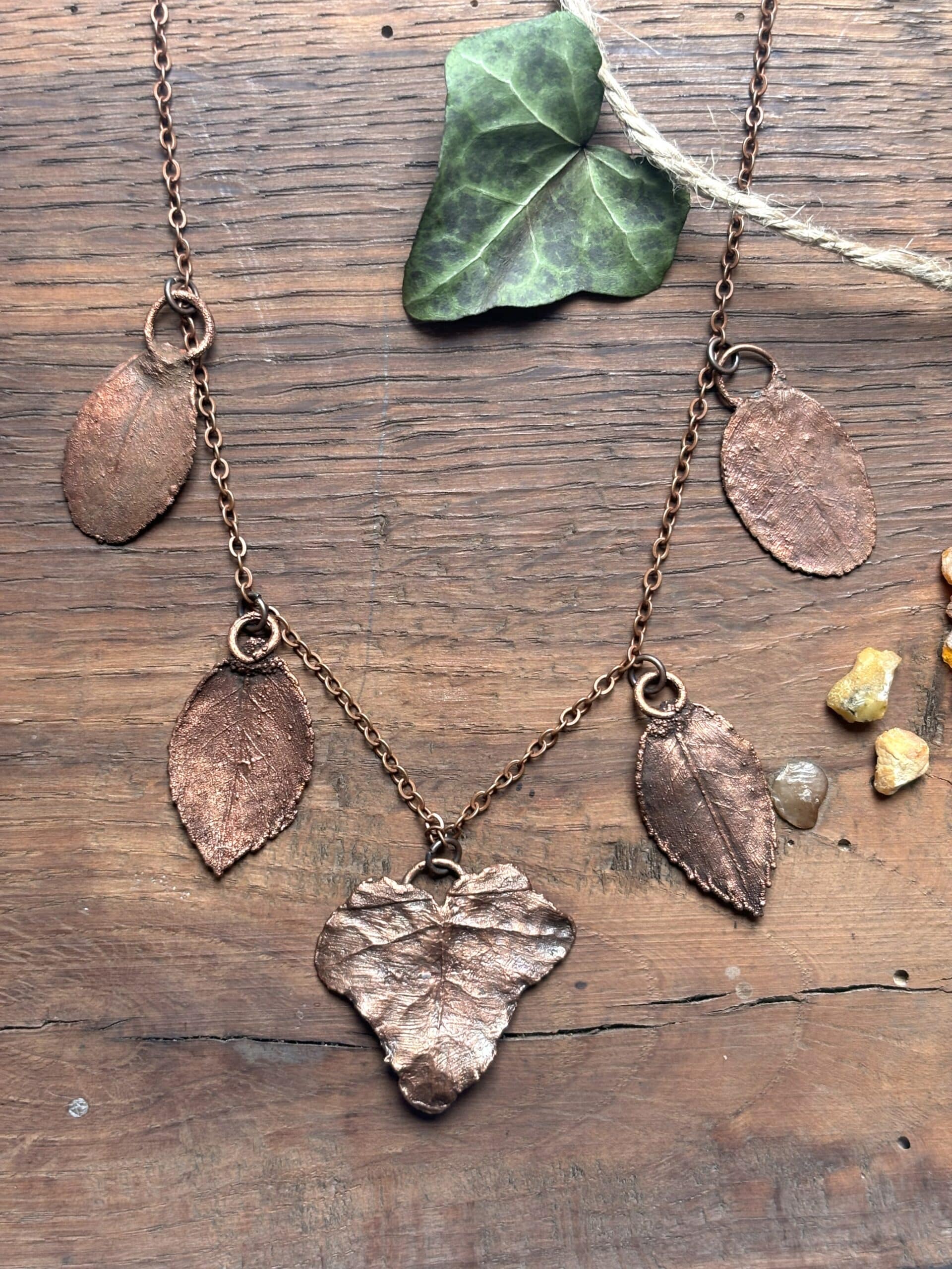 Naszyjnik z miedzi to autorska kompozycja stworzona z roślin znalezionych w trakcie spaceru. Wśród miedzianych zawieszek znajduje się liść bluszczu – wieloznaczny symbol wierności, nieśmiertelności, silnego przywiązania oraz ochrony, wywodzący się z antycznych wierzeń. Ze względu na swoją zimozieloność oznacza wytrzymałość i ciągłość życia. Jest naturalnym talizmanem, przypomina o zdolności wzrostu mimo trudnych warunków. Jego symbolika związana jest z lojalnością i oddaniem, miłością oraz długimi i trwałymi relacjami.